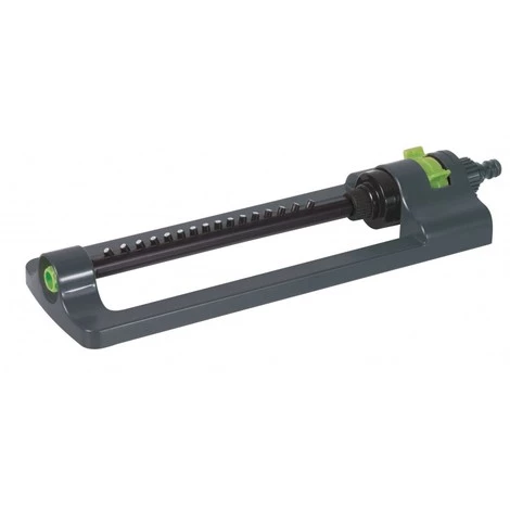Cet arroseur oscillant à turbine en plastique est muni de 16 buses. Cela permet d’arroser une surface d’environ 199 m2, soit 12 x 16.6 mètres. Il est possible de régler la surface à arroser. Pour amortir les coups éventuels, la rampe d’arrosage est flexible.
