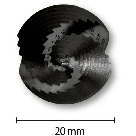 Sa forme spirale, dite aussi “hélicoïdale“ permet avec moins d’efforts une progression plus rapide et sans bavures à différents diamètres. Ne nécessite pas d’avant-trou. L’acier HSS M35 COBALT augmente sa résistance à l’échauffement.