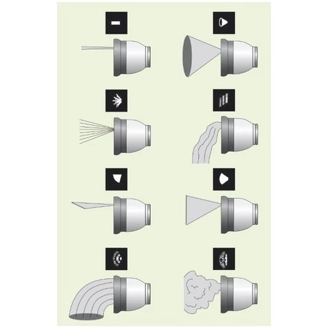 jet crayon, cône, mousseur, cône fin, plat horizontal, plat vertical, pluie et brouillard.