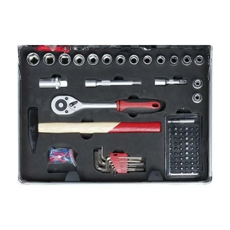 – 1 coffret en plastique comprenant 1 porte embout 60 mm et 60 embouts de vissage 25 mm : 7 embouts plats, 7 Phillips, 7 Pozydriv, 12 six pans creux, 6 six pans creux avec goupille de sécurité, 10 torx, 7 torx avec goupille de sécurité, 4 en U à double pointe