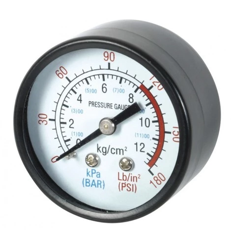 Ce manomètre est gradué en Bar et PSI. Il fait de 0 à 12 bars. Au dos du boitier, il a un raccord mâle 1/4 » (8 x 13).