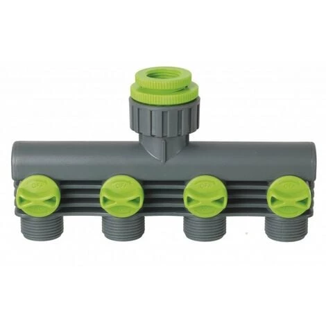 Ce nez de robinet est fileté 26/34 (1“) avec une réduction 20 x 27 (3/4“) et une réduction 15 x 21 (1/2“). Il est muni de 4 circuits filetés 20 x 27 (3/4”) avec raccords rapides.