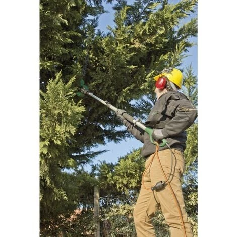 Coupe de branche Ø maxi 16 mm. Câble électrique 0,35 m avec système de blocage. Livré avec fourreau de protection de la lame et une sangle de maintien réglable.Taille-haies électrique à tête orientable et manche télescopique. Lame 510 mm. Moteur 230-240 V – 50 Hz. Puissance 450 W. Vitesse : 1 600 tr/min. Protection Classe II.